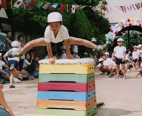 月見幼稚園では特別な施設を借りての運動会や発表会は行わず園内で開催します。ご観覧いただくご家族の皆様にとっては充分な広さではないかもしれませんが、子どもたちが日々生活の中でこつこつと積み上げてきた力を、いつもの場所で安心して思う存分発揮してほしいからです。また、子どもたちの日常の様子を間近にご覧いただき、子どもたちと一緒に感動してほしいと願っておりますので、幼稚園にお越しいただける機会は度々あります。